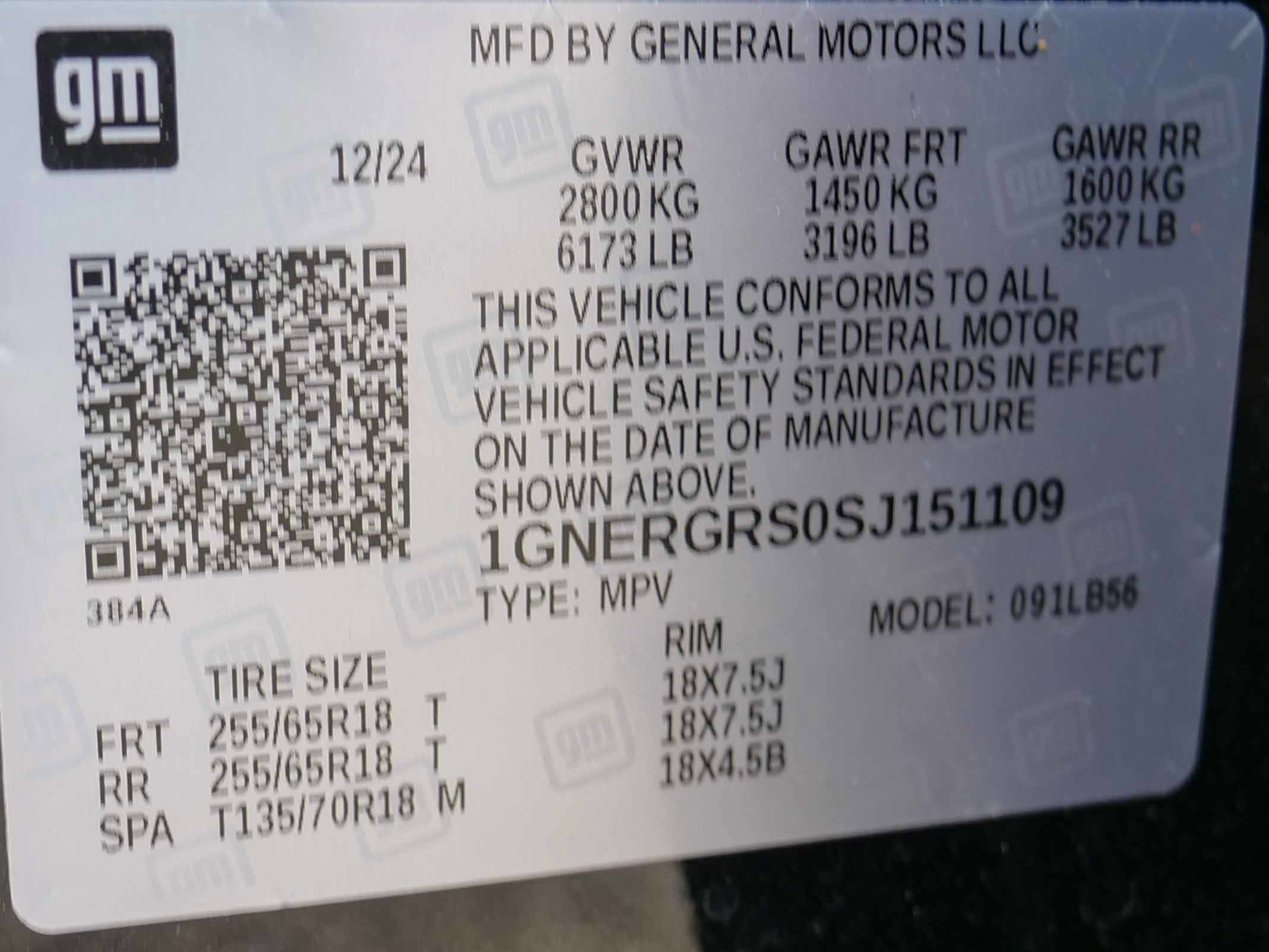 GVWR, 6173 lbs (2800 kg);